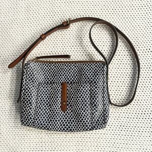 From Fossil. Style name Gemma. Navy multi. Top zip small coated canvas crossbody with tan leather trim and crossbody adjustable strap. Front exterior pocket. Preowned. Some light wear along corners as shown in photos. Overall condition in great condition.