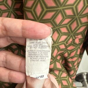 Can be worn as a Tunic - very chic with a pair of “leather” leggings or as a mini dress with a retro feel. Slash hip pockets on each side. Lined. Muted Pink and Moss green geometric print. Versatile.