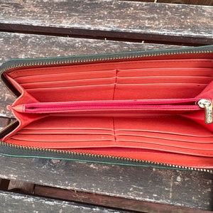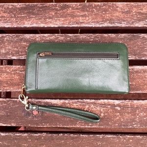 Fossil Bowler Bag - Green vintage print with exterior phone pocket and interior pockets, card holder slots, and key saver. Adjustable and removable crossbody strap. Fossil Zip Around Clutch Wallet - in Green with Coral interior. Multiple card slots and zipper pockets. Wristlet option in removable.
