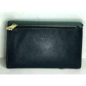This is for a lightly distressed Green and Blue Leather Checkbook Card ID Clutch Wallet, by FOSSIL! (Missing wrist strap)*** This has a prior monogram of MLC at the outer back***
