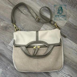 EUC Fossil Creamy white leather, with bronze trim and coper zippers and pulls. Cross Body, Hand, or Shoulder bag options