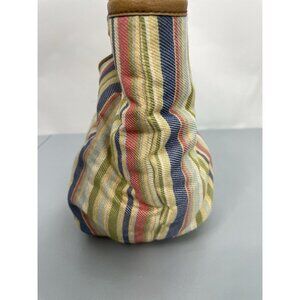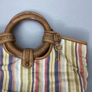 Fossil Handbag Purse Wood Ring Handles Canvas Stripes Hobo Rustic Retro Hippie