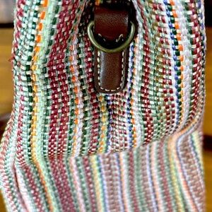 Fossil Handcrafted Bag 14”L 11”H Wood Handles & Shoulder Strap Weave Multicolor