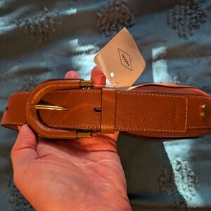 Fossil Harwell Brown Leather Shoulder Crescent Bag with Gold Accents
