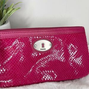 Excellent used Condition Women’s Fossil Hot Pink Cow Hide Leather with Snake Emboss Wristlet Wallet Pouch