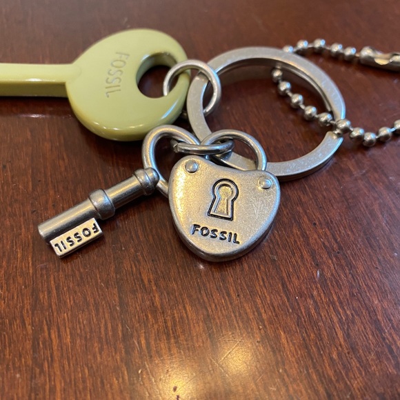 Super cute Fossil keychain. Features a large plastic key and metal lock and key. Great for keys or hang on your bag.