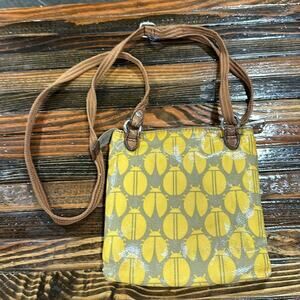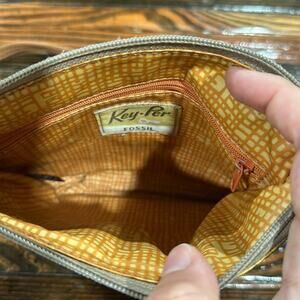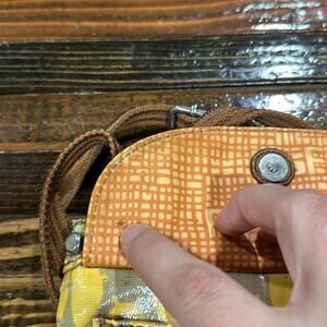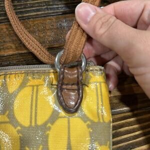 Fossil key per yellow ladybug coated canvas crossbody purse. Shows some signs of wear- fraying on strap does not affect wear and isn’t noticeable when worn. Some cracking on the back at the seam. Please see pictures for signs of wear.