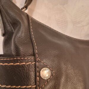 Vintage Fossil Purse Satchel Shoulder Bag Black Leather with Zip Closure, Tassel Pull, Silver Signature Hardware and Contrast Stitching