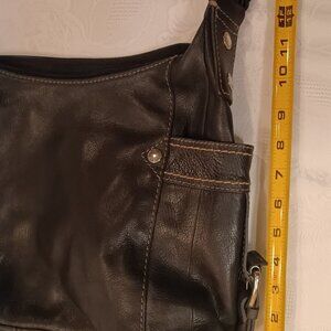 Fossil Key Purse Satchel Shoulder Bag Leather Black Zip Tassel Silver Contrast