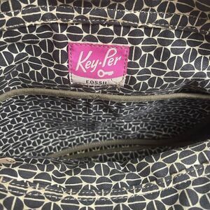 Fossil Key-Per Coated canvas black tan leather trim medium Shoulder magnetic top closure the inside lining has a side zipper and two side pockets.Pre owned in good used condition normal wear see all pictures any questions please message.V1