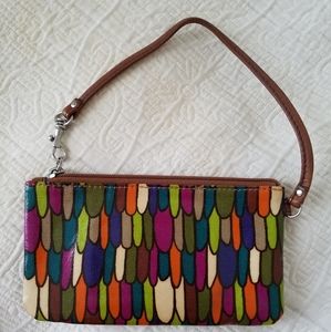 Fossil Key-Per colorful Wristlet. Coated canvas and leather. Multicolor. Preowned. Nice condition, clean inside, no rips or holes noted. Approximately 7-1/4" long, 4" wide. Wrist strap drop is about 6".