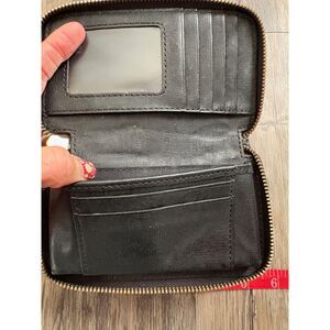 Wallet is black and grey with gold hardware. It has some wear, including scuffs and discoloring. Please look at the pictures carefully.