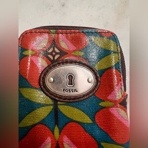 Vibrant Fossil wristlet with floral pattern. Features a handy strap for easy use.