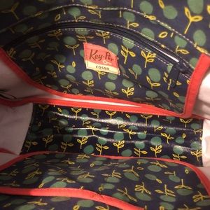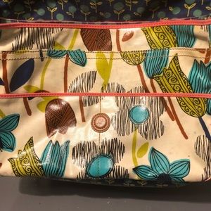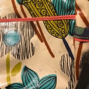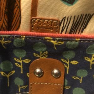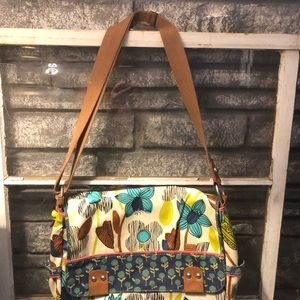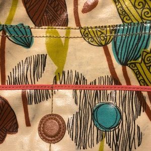 Fossil key-per large messenger bag. 60's hippie floral design in a vinyl coated cloth. Magnetized flip top closure with leather and silver stud accents. Large rear pocket with magnetized closure under the flap is one large pocket and two smaller with small open pocket on each end. Long adjustable strap from 15.5-26". Some color transfer noted please refer to pics