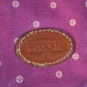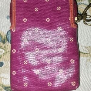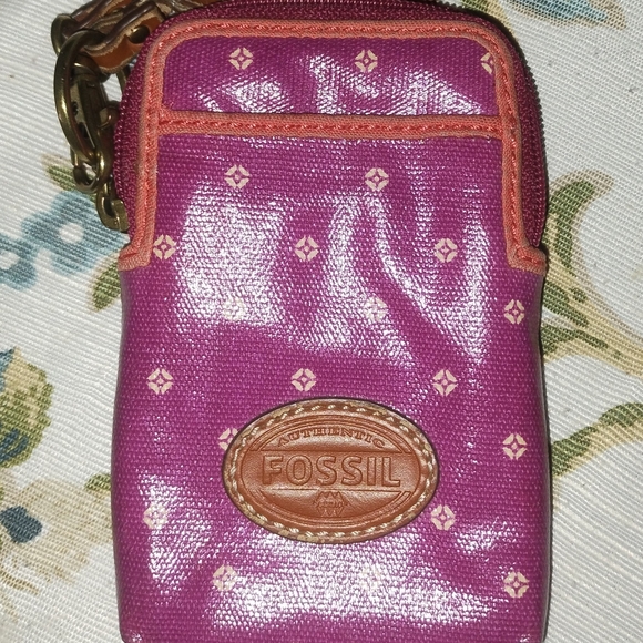Fossil Key-Per coated canvas wristlet wallet. Front pocket, card slots inside, the strap has wear on the underside, as seen in pics.