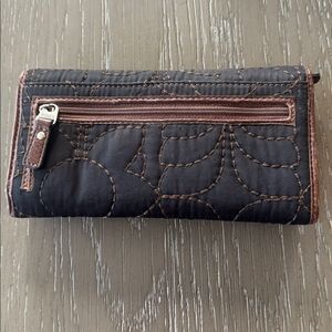 Chic Fossil wallet with quilted texture. Features black and brown tones. Secure snap closure.