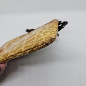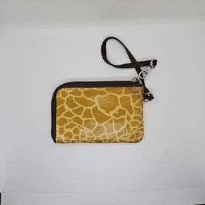 Giraffe print coated canvas wristlet with brown leather strap and trim. One exterior slip pocket. Main compartment is zippered. Main compartment has a few slots for cards.