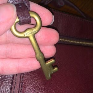 Beautiful preowned leather bag by Fossil. Deep Burgandy wine colored pebbled leather with lots of pockets. Fully adjustable long strap to convert from crossbody to shoulder bag. Key shaped bag fob attached. Signs of normal wear: wear on bottom corners, some fading to the front suede pocket (not noticeable unless the flap is opened). The decorative leather tab on the front is beginning to split. Fairly clean interior. No holes or stains and smoke free!