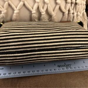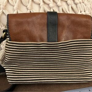 Chic Fossil crossbody with tan leather flap. Black and cream striped design. Adjustable black strap. Ideal for daily wear. Good condition.