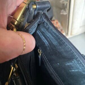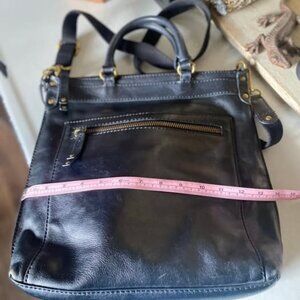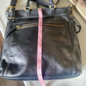 This bag is perfect for meetings, interviewing or travel. Black genuine leather with Fossil's signature brass hardware and fabric lined [pic w/minimal damage shown]. Adjustable & Detachable Shoulder Strap and two handles provides optional ways to carry it. She has some miles on her but is in very good condition!