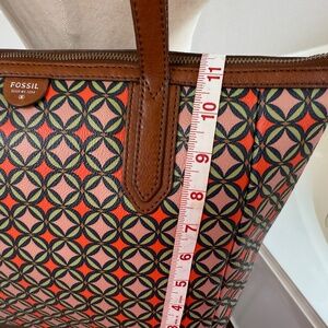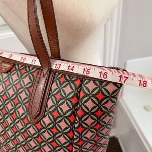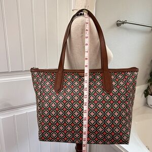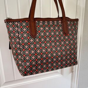 -Brown, pink, orange, green geometric patterned coated canvas with brown leather trim and handles.