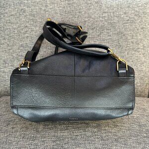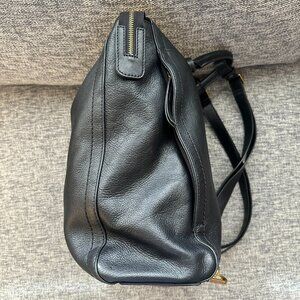 Fossil GUC black leather backpack comes with adjustable straps, zipper closure, fun zip pocket on outside of back for easy access of things. Gold hardware.