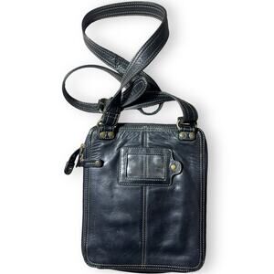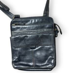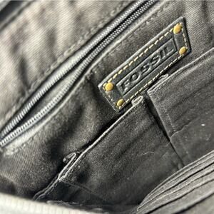 Black Leather, adjustable strap, two zip top compartments, exterior flap compartment, Fossil logo tag inside, Fossil embossed on outside hardware, very good condition.
