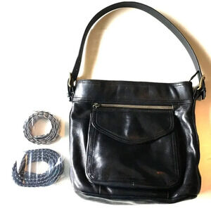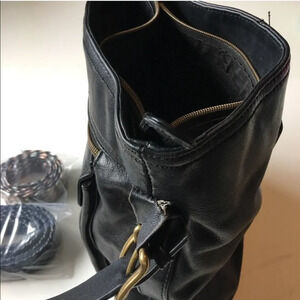 I upcycled this Fossil purse that was missing a shoulder strap. I cut 4 different styles of belts to create interchangeable straps. Lots of pockets, compartments & brass hardware. Cool broken in vintage purse.