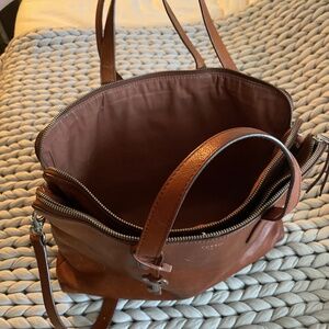 Genuine Fossil Leather workbag that fits a 15" laptop easily. Two-sided compartment with magnet closure in the center and zipper to close both sides. Leather strap can be removed and carried like a briefcase. In good condition, just normal wear and tear, minimally used.