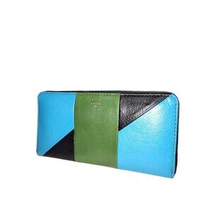 Blue, green, and black leather wallet with detachable wrist strap in great condition.