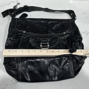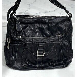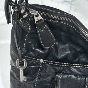 Fossil Leather Shoulder Bag Black Contrast Stitch Buckle Pocket Key Fob Retro