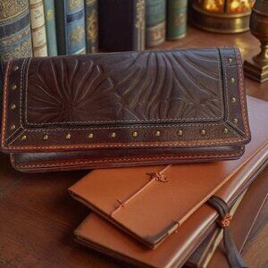 This Fossil genuine leather wallet brings together timeless western charm and bohemian character. Crafted from rich brown leather with intricate tooled floral embossing, antique gold stud trim, and durable stitching, it's both stylish and functional.