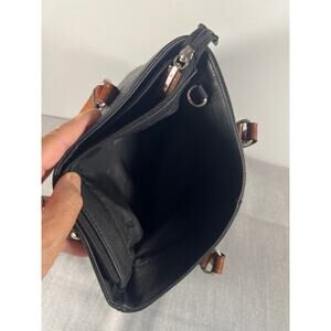 PREOWNED. Small Fossil Leather Tote Bag, Black pebbled leather with brown handles. 5 compartments in the inside. Size: 7” height x 8 1/2” lenght x 3 1/4” width. Handle drop 4 1/2”. Please look through all the photos for the condition of this bag. No odor. Interior have some makeup stains that can be wiped off. Note: One of the leather handle connected to the O ring are worn and stretched. But still holding up and able to carry daily necessities.