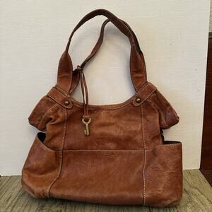 Fossil genuine leather shoulder tote in a rich distressed brown with floral embossing and antique brass stud details. Features dual shoulder straps, large exterior pockets, and a spacious interior with logo lining. Beautifully broken-in leather with a soft, lived-in feel.