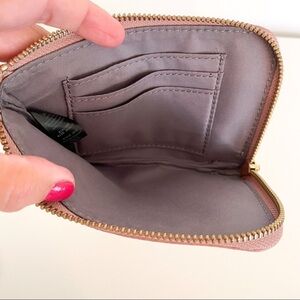 Fossil Leather Wallet Wristlet in Light Pink. 100% leather, zip closure, interior card slip pockets, wristlet handle. Approximate measurements: 6.5" x 4.5". Very good pre-owned condition, minimal signs of wear throughout. The zipper pull is missing, but still functional. Price reflects.