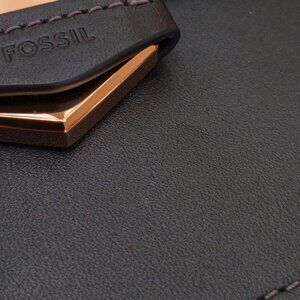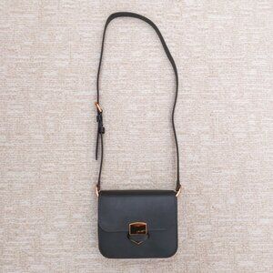 This is a like-new structured crossbody from Fossil’s Lennox line. It’s made of smooth black leather with gold-tone hardware and an angular clasp. The shape is clean and modern, with subtle stitching and an adjustable strap.