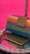Colorful Fossil wallet with leather stripes. Features pink, orange, green, and brown tones. Stylish and vibrant design. There are 26 card slots, 3 bill compartments 1 ID window, and 1 middle zipper compartment. It can hold an iPhone 14 Plus. It closes either a flap.