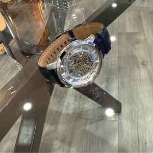 Discover the Fossil watch with a striking skeleton dial. Black leather strap complements the silver case. Perfect for modern style. Whether dressing for the office or weekend, this timepiece has the mark of distinction NWT comes with authentic fossil collectible tin.