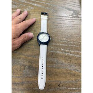 The Fossil black white quartz Watch offers a blend of casual elegance and functionality. The white silicone strap ensures comfort, while the blue dial adds a touch of sophistication. Ideal for everyday wear, this watch is both stylish and practical, designed to complement any attire with ease. It is in good working condition as noted by the pics here. Look great. SKU 8813