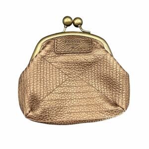 Fossil metallic gold leather kiss-lock coin purse with retro brass frame. Textured geometric quilted front, soft pebbled leather back, and warm brown lining. Compact size—perfect for coins, cards, earbuds, or small essentials. Classic vintage-inspired Fossil style with durable metal clasp. Clean interior and gentle exterior wear only.