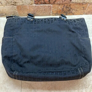 Fossil Modern Vintage tote made from sturdy black jacquard fabric with allover Fossil “F” logo pattern and contrast stitching. Features dual canvas webbing shoulder straps with silver hardware, multiple front zip pockets, side slip pockets, and top zip closure. Spacious lined interior includes a zip pocket and slip compartments with Fossil logo patch.