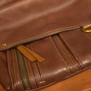 This Fossil Morgan Traveler crossbody bag is in good preowned condition. There are some very light scuffs and signs of wear on the exterior. No rips or tears were noted on the inside lining. The bag is made of genuine pebbled leather exterior with a fabric lining. It is brown color sometimes referred to as espresso or dark brown. It has gold tone or brass hardware. It features an adjustable crossbody strap. The strap is not removable. It has multiple exterior and interior pockets including a back slip pocket and front snap-flap pockets. The main compartment has a zipper closure. It has a place for cards and a key ring holder on the outside. It has a zipper pocket on the inside along with two slip pockets. Its approximate dimensions are width 10.5 to 11 inches. Height is 11 to 12 inches. The depth is 2 to 3 inches. Please see images and ask any questions you may have.