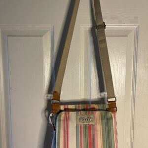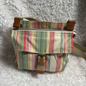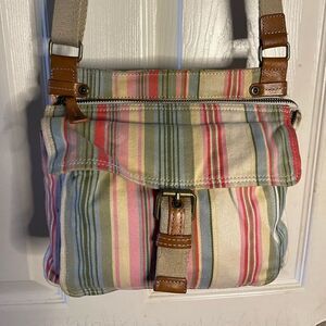 Fossil Multi pastel color small crossbody bag brown leather trims .