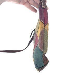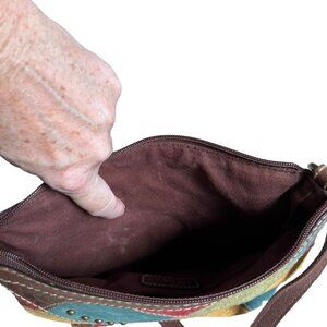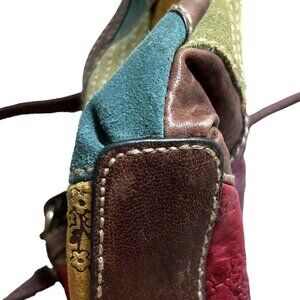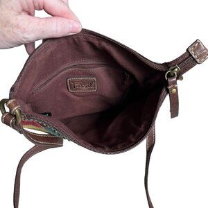 Stylish Fossil crossbody bag with a patchwork design. Features a mix of vibrant colors and patterns. Perfect for everyday use.