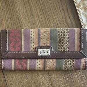 Stylish vintage Fossil wallet with multicolor patterns. Features red, purple, and brown tones.