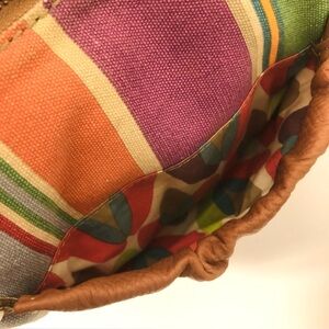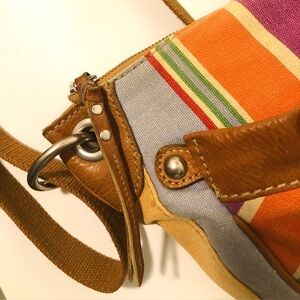 Fossil canvas and leather crossbody with multicolor stripes. Features durable strap and front pocket. Ideal for casual outings.