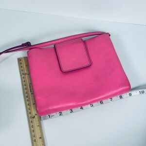 Features: Neon pink. Genuine leather. Amazing quality! Crossbody style but it comes with a wrist strap so you can use the purse as a wristlet.