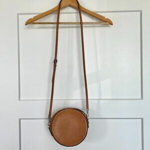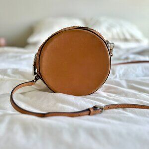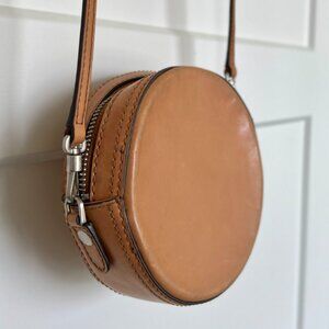 Beautiful and hard-to-find Fossil × Opening Ceremony round crossbody bag in rich tan genuine leather. This limited-edition collaboration combines Fossil’s classic craftsmanship with Opening Ceremony’s modern minimalist style.