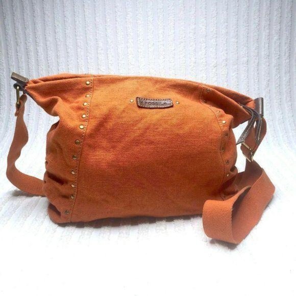 Stylish Fossil shoulder bag. Vibrant orange color. Features studded accents. Adjustable strap for comfort.