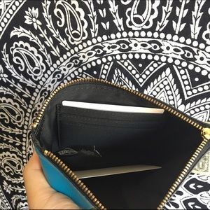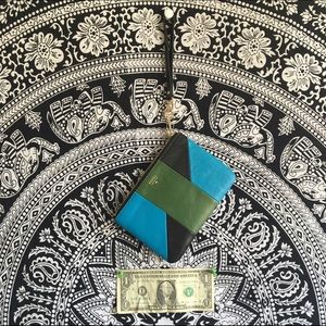 This multicolored, wristlet sized clutch is a genuine leather product by Fossil. It is 7"x5" and is large enough to hold any phone. On the inside, it is lined in black and has three credit card pocket. It is brand new with the tags included. The product is $75 from the Fossil website. I am selling it for $45.